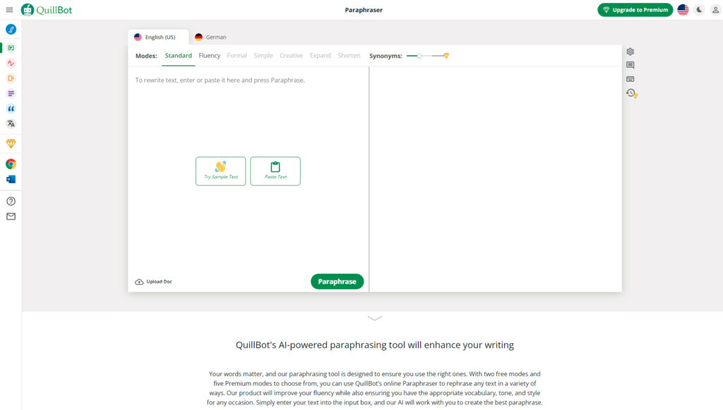 Múltiples modos para adaptarse a tus necesidades: QuillBot ofrece dos modos gratuitos y cinco modos premium para personalizar aún más el texto reformulado. Si estás buscando una solución básica, los modos gratuitos son perfectos para ti. Por otro lado, si necesitas un mayor nivel de personalización, los modos premium te brindan un control total sobre los cambios de vocabulario y te permiten elegir entre una lista de sinónimos, gracias a la funcionalidad del Synonym Slider y el AI Thesaurus.